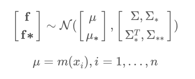 - 이때, 우리가 찾고 싶은 $f \ast$ 의 조건부 분포는 결합 정규분포를 조건화하는 공식에 따라 $f \ast \rvert f ~ N(\mu \ast + \Sigma \ast^T \Sigma^{-1} (f - \mu), ; \Sigma \ast \ast - \Sigma \ast^T \Sigma^{-1} \Sigma \ast)$ 과 같이 주어진다.