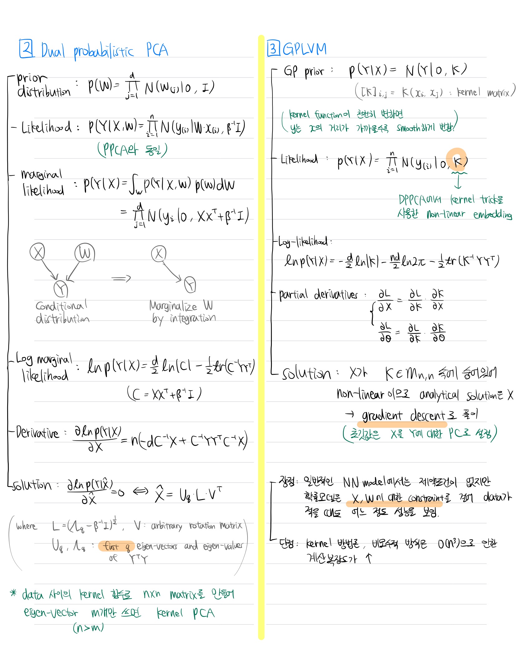 - Gaussian Process를 이해하기 위해서는 다변량 정규분포(MVN)에 대한 지식이 필요하다. MVN을 따르는 확률변수의 어떤 부분집합에 대해 주변 분포와 조건부 분포 모두 정규분포를 따르는 성질에 더해 GP는 MVN을 무한 차원으로 확장시키는 함수에 대한 분포다. 평균 함수와 공분산 함수를 통해 정의되는 GP에서 중요한 성질 중 하나는