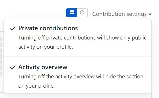 - 사진 우측 상단의 "Contribution settings"을 클릭하면 아래와 같이 "Private contributions"와 "Activity overview" 항목이 나타난다.