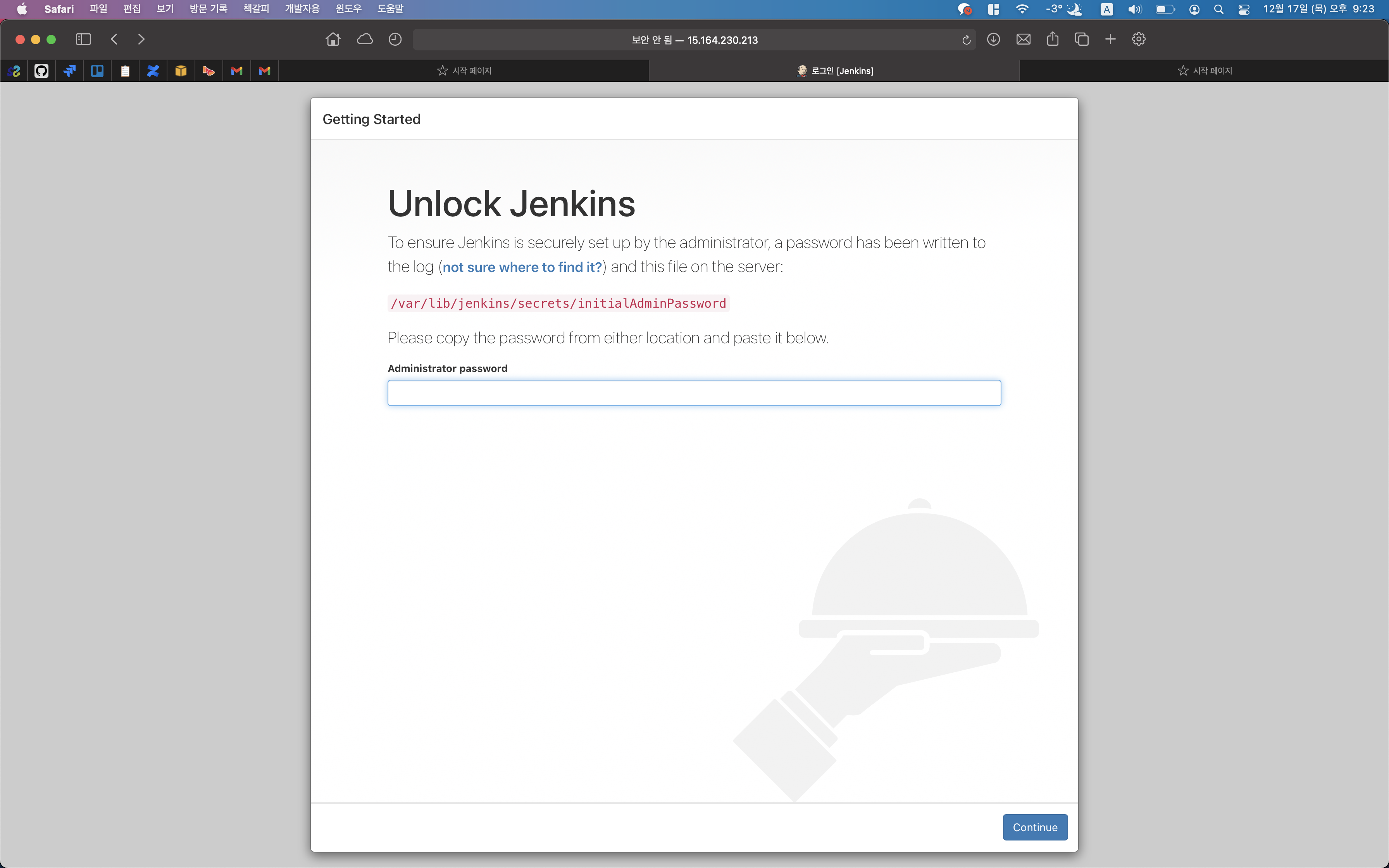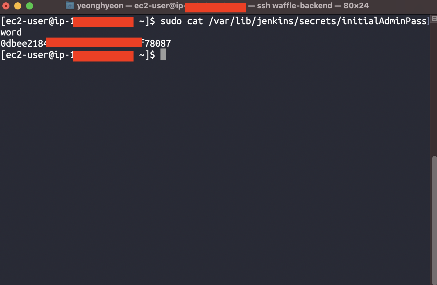 sudo cat /var/lib/jenkins/secrets/initialAdminPassword를 입력하면 terminal에 password가 딱 하고 나타난다.