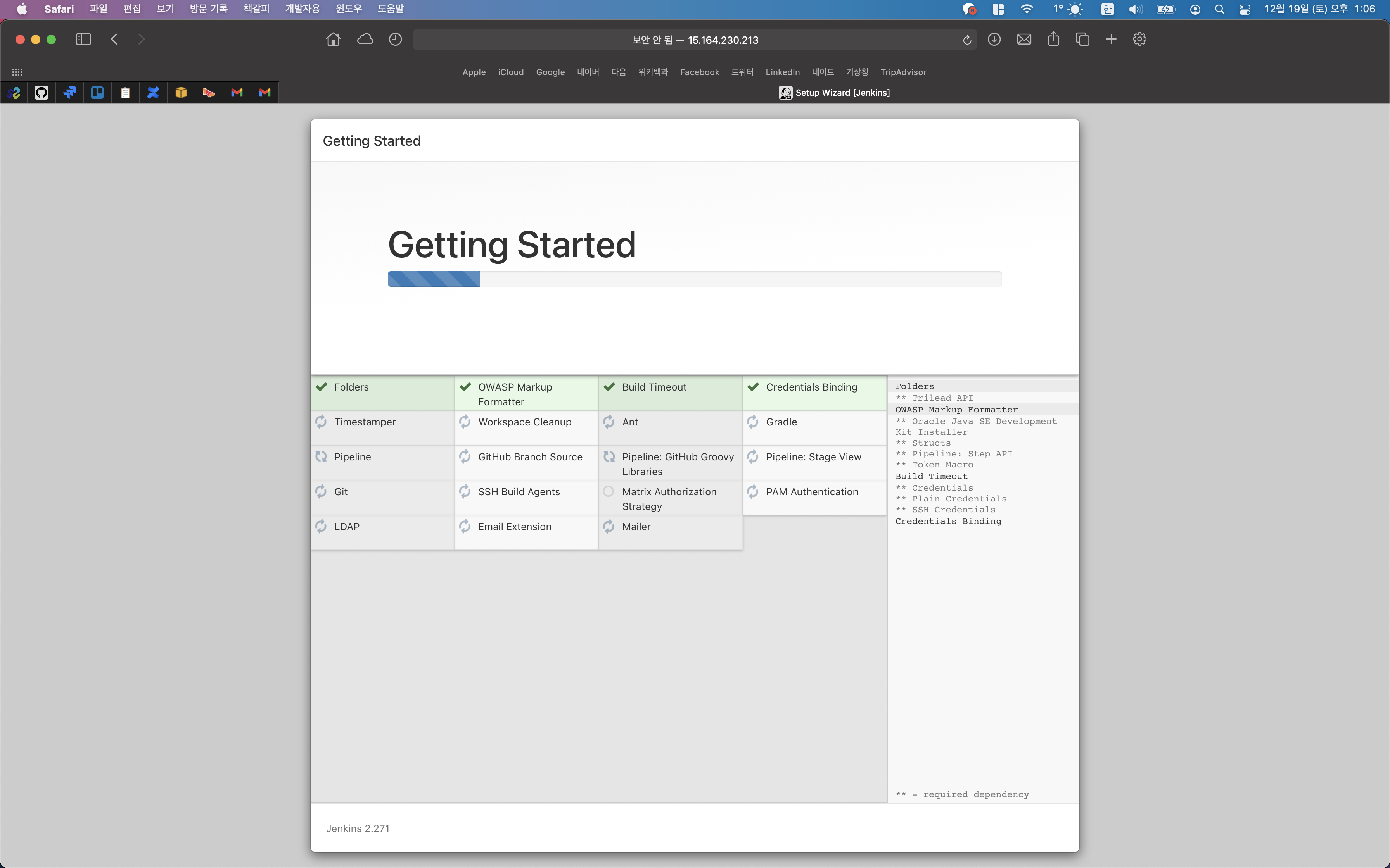 - Install Suggested Plugins를 클릭하여 Jenkins에서 권장하는 모든 Plugin들을 설치해주면 된다. 시간이 다소 소요된다.