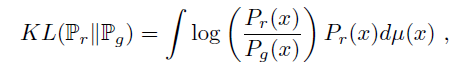 - x=0일 때 measure가 정의된 분포 P와 x=0.5일 때 measure가 정의된 분포 Q의 KLD, JSD, WD를 구해보면 각각 무한대, log2, 확률변수의 절댓값이 나옵니다. KLD, JSD의 경우 확률분포 P와 Q가 완전히 다르다고 판단해버리며 metric 계산 값이 GAN의 학습과정에서 Discriminator의 gradient를 소실시키는 원인이 됩니다.