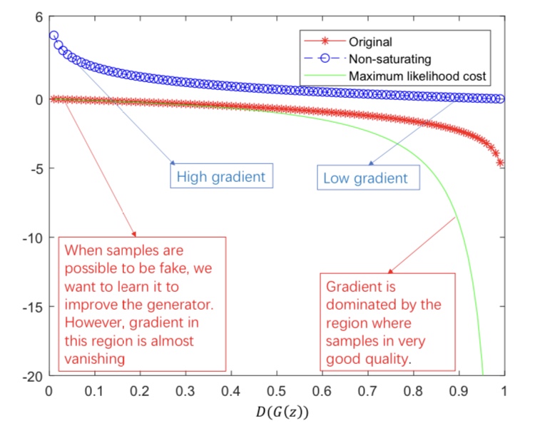* Vanishing Gradient : D(G(z))가 0에 수렴해버리는 문제