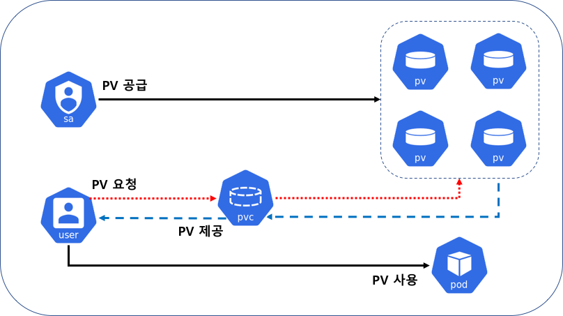 1. 클러스터 관리자는 물리적 스토리지와 연결되는 PV를 생성합니다. 만들어진 PV는 Pod와 직접적으로 연결되지 않습니다.