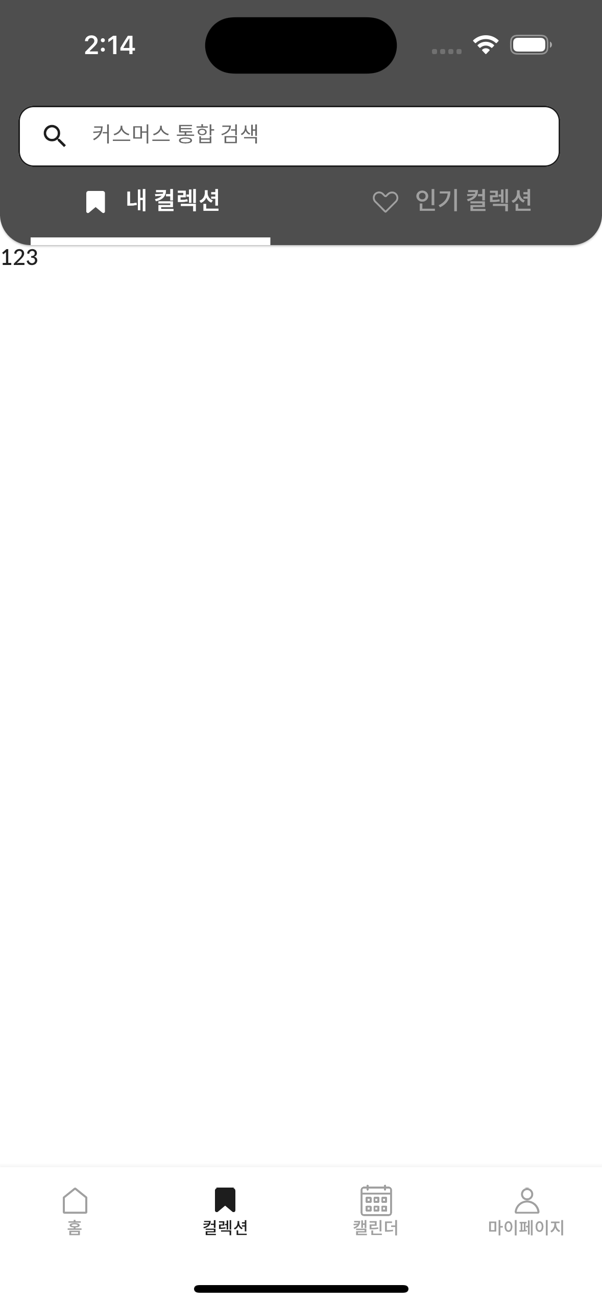 이때, TabBarView의 자식들을 Text()로 구성하면 슬라이드가 되는 것을 확인했습니다. 본디 코드에서 children으로 지정한 CollectionMine에는 RefreshIndicator 위젯을 사용하는데요, 아래쪽으로 화면을 pull하여 refresh 함수를 지정하는 위젯인만큼 slide 동작에 영향을 미치지는 않을까 하는 생각에 이르렀습니다.